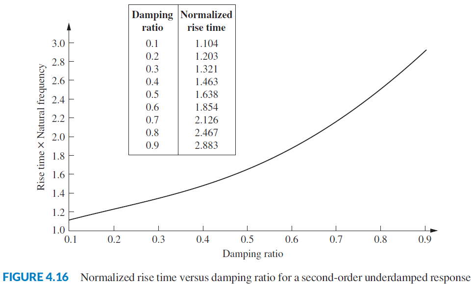 Time required for waveform to go from 10% final value to 90% final value. This cannot be solved analytically for a specific $\zeta$, but can be solved numerically using $\omega_n T_r$, a normalized rise time.