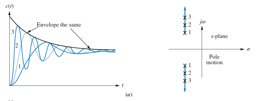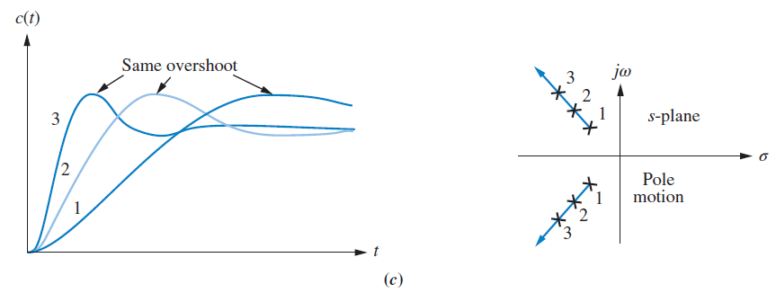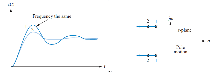 Horizontal motion of a pole corresponds to maintaining a constant peak time (both $T_p$ and $\omega_n \sqrt{1 – \zeta^2}$ are preserved)