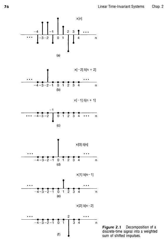 x[n] &= \dots + x[-2] \delta[n + 2] + x[-1] \delta[n + 1] + x[0] \delta[n] + x[1] \delta[n – 1] + x[2] \delta[n – 2] + \dots \\