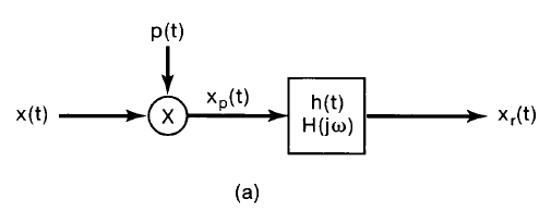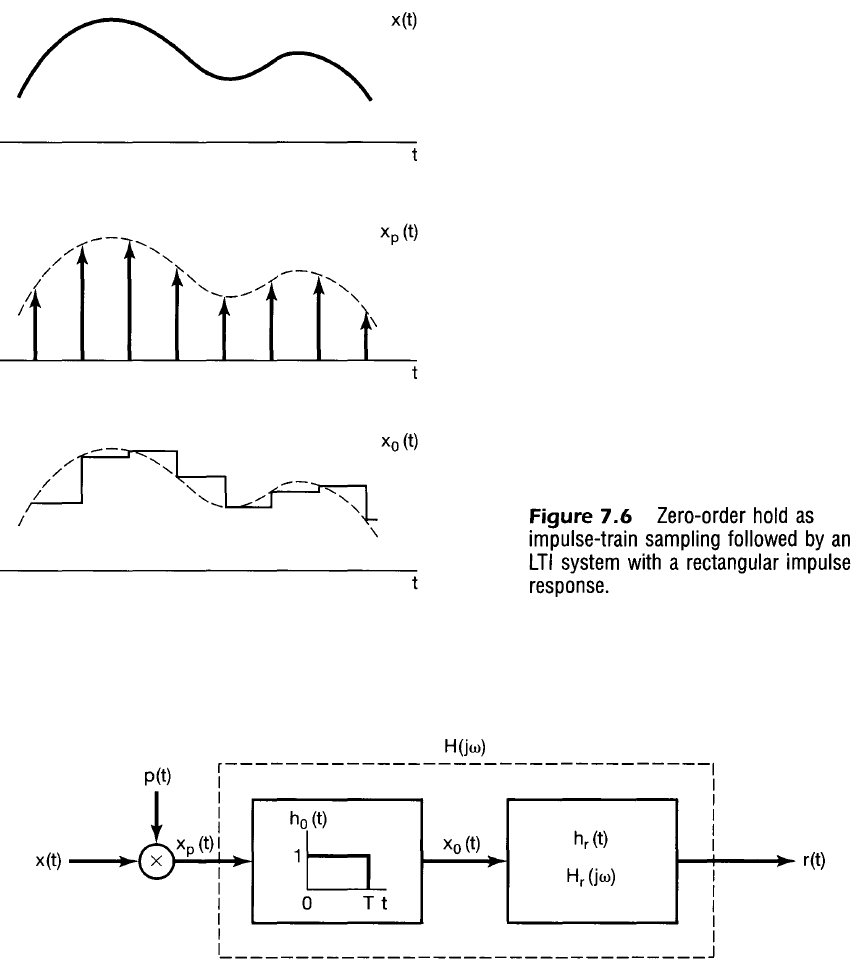 More common in practice than multiplying input signal by generated impulses. Output is equivalent to convolving $x_p(t)$ (same as above) with a filter, $H_0(j \omega)$, that has impulse response, $h_0(t)$, that is unity between $t=0$ and $t=T$.
