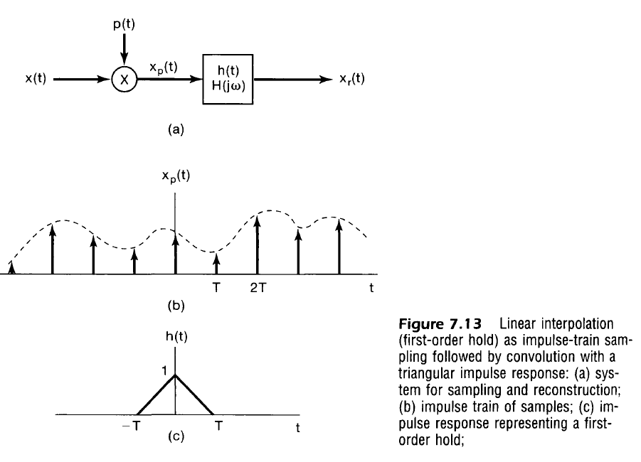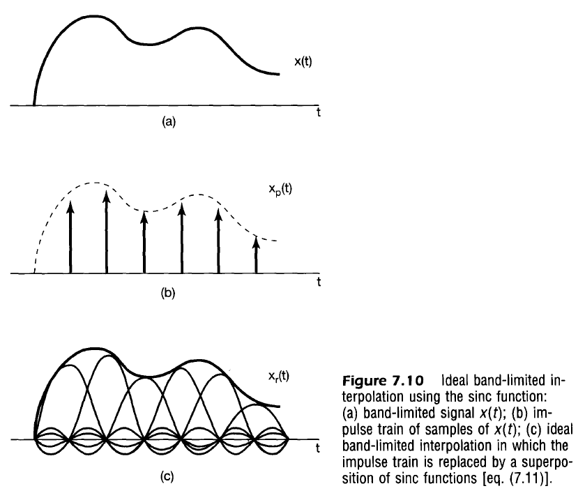 An interpolating filter $h(t)$ would then generate a recreated signal, $x_r(t)$ be described as