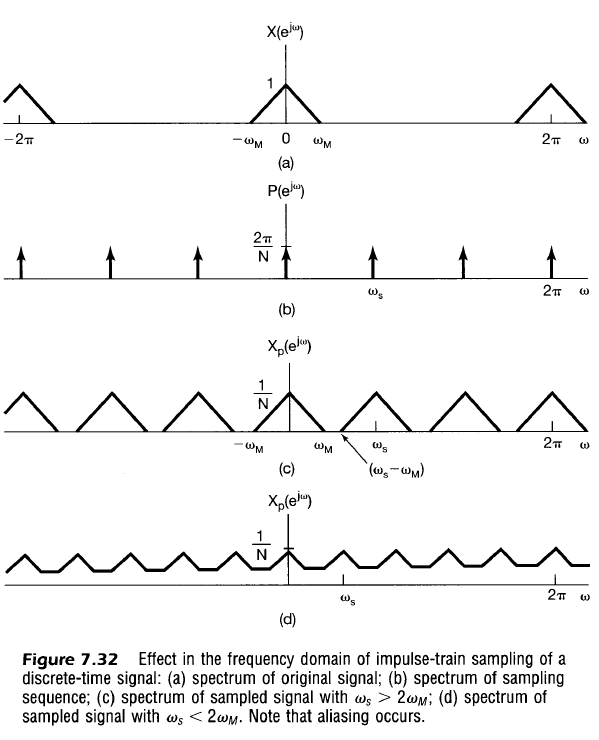 X_p(e^{j \omega}) &= \frac{1}{N} \left[ X(e^{j \omega}) + X(e^{j (\omega – \frac{2 \pi}{N})}) + X(e^{j (\omega – \frac{4 \pi}{N})}) + \dots + X(e^{j (\omega – (N-1)\frac{2 \pi}{N})}) \right] \\