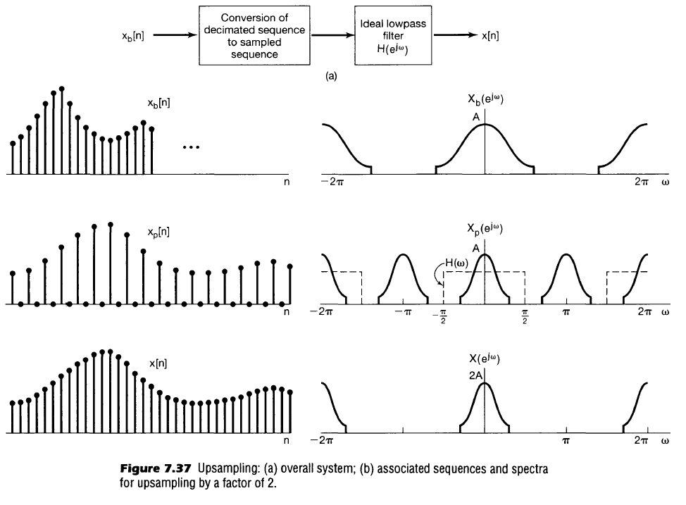 Upsampling may also be employed using a lowpass filter to convert to a higher equivalent sampling rate. This process is effctively the reverse of downsampling and is shown below.